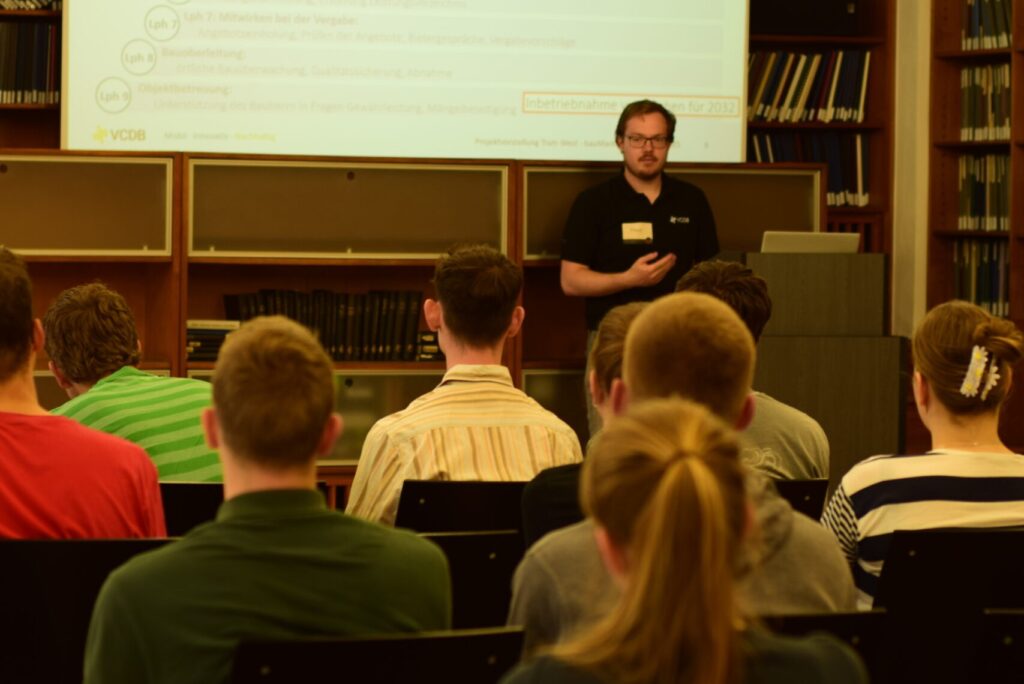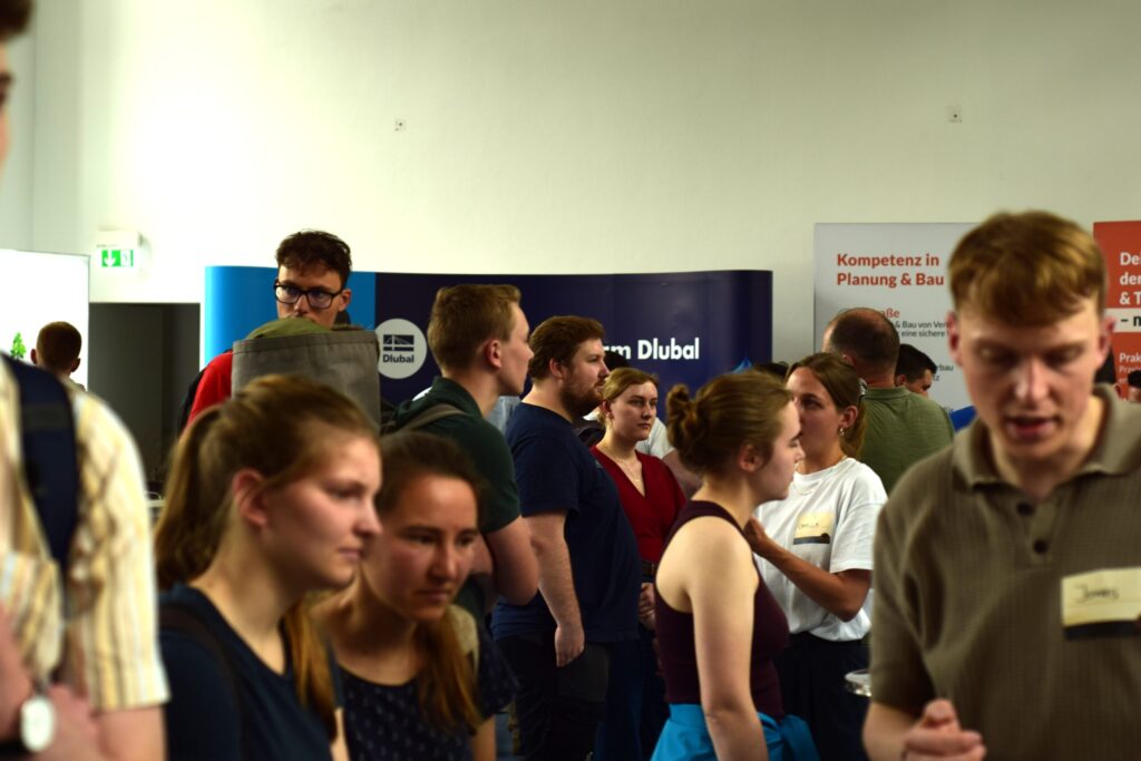 Insgesamt zwölf Firmen aus den Bereichen Gebäude- und Energiemanagement, Verkehrs- und Wasserbau, Brückenbau, Hochbau und Softwareentwicklung präsentierten sich an den Messeständen. Viele Studierende nutzen die Gelegenheit, mit den Firmenvertretern persönlich ins Gespräch zu kommen – sei es für ein erstes Kennenlernen, gezielte Fragen zu Praktika und Abschlussarbeiten oder konkreten Einstiegsmöglichkeiten. Zusätzlich gab es für die Firmen wieder die Möglichkeit, im Rahmen eines kurzen Pitches ihre Aufgaben & Tätigkeitsfelder anhand eines spannenden Projektes zu präsentieren und passend dazu bot der Career Service der TUD einen kostenlosen „Bewerbungsmappencheck“ an